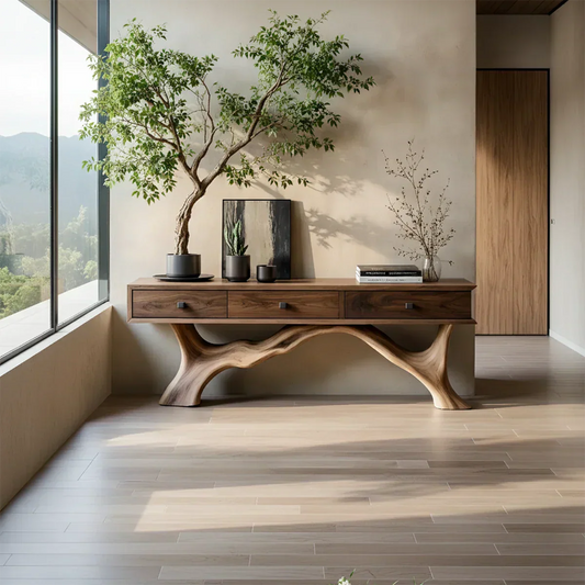 Solid Wood Console Table with Sculpted Root-Inspired Base & Drawers