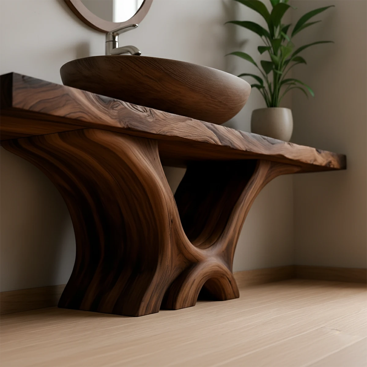 With its twin curved base and bold grain patterns, this vanity stands as a centerpiece of Wabi Sabi beauty and functional art. The generous live-edge top supports vessel sinks with balanced elegance. It blends effortlessly into Organic Modern and Japandi-inspired bathrooms, offering both grounding presence and sculptural sophistication.
